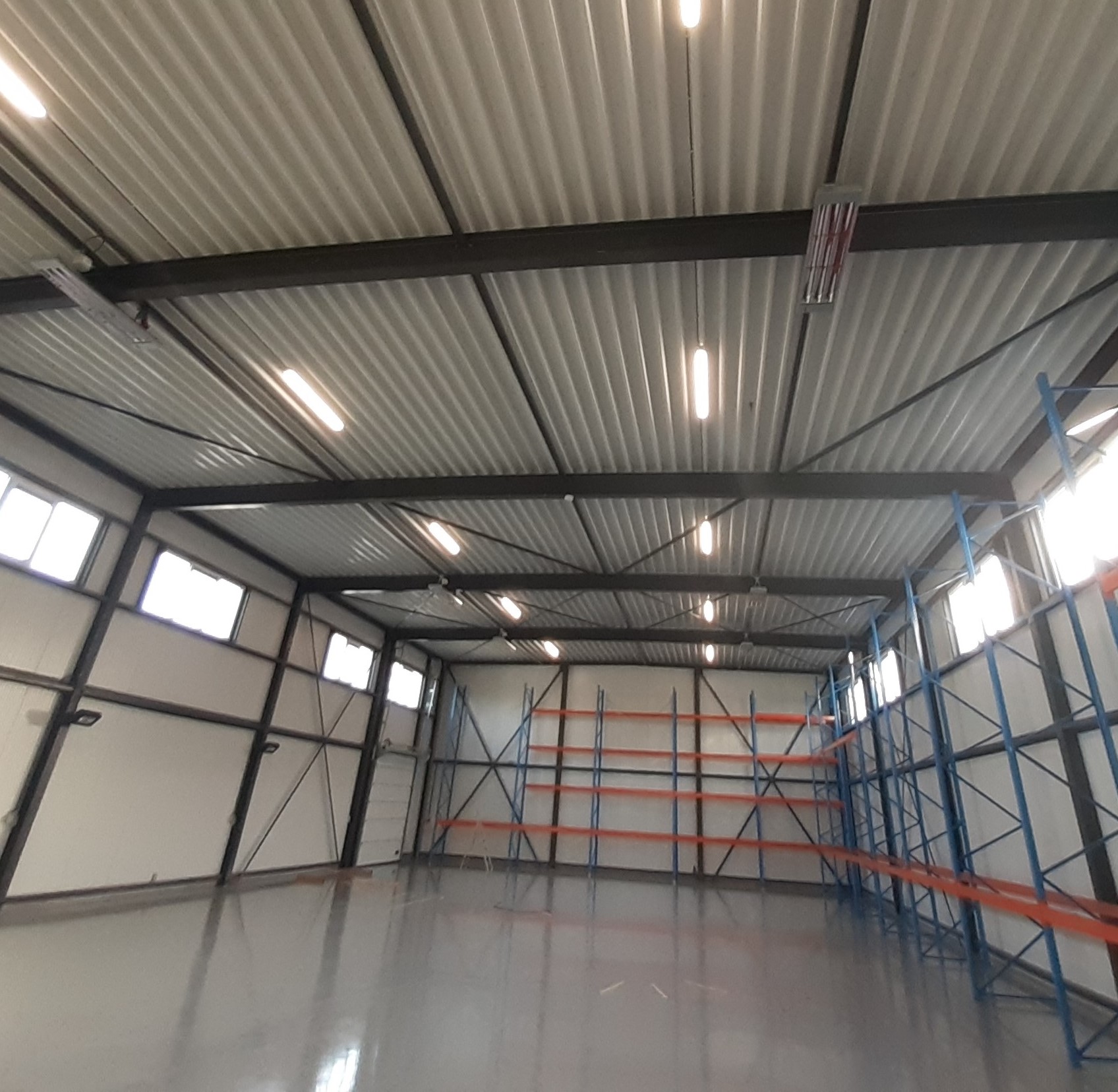Bedrijfshal 1 hebben we verwarmd met 6 stuks IR4500 infraroodstraler van het merk Frico. Tevens hebben we in deze bedrijfshal 2 werkplekken verwarmd doormiddel van 2 stuks kortegolf infrarood stralers type Apollo van het merk Tansun. De werkplek stralers worden in - en uitgeschakeld doormiddel van een timer met pulsdrukker. De regeling van deze stralers gaat doormiddel van een draadloze W2Go klokthermostaat en hoog vermogen ontvangers. Er is in deze bedrijfshal vooral gekeken naar zoveel mogelijk energie besparen. het magazijn kan op 10 graden worden verwarmd en de werkplekken op momenten dat het nodig is op 15 graden.