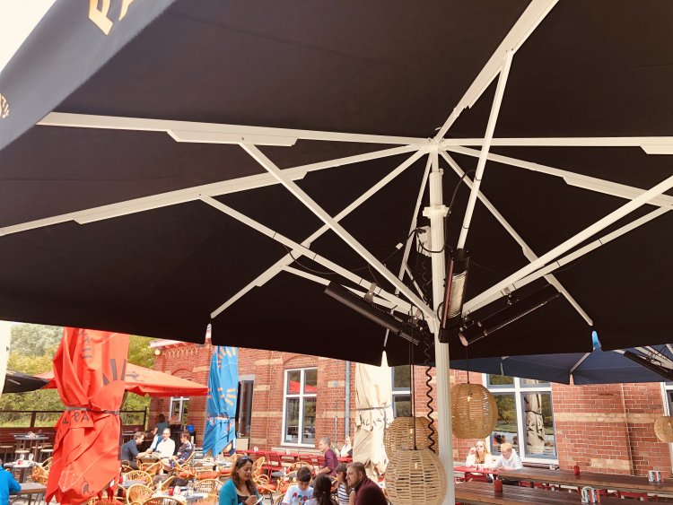De regeling van deze installatie is een nieuwe vinding van Wardenaar infrarood verwarming. De stralers gaan automatisch aan en uit bij het openen en sluiten van de parasols. indien de parasols zijn gesloten is het niet mogelijk om de terrasstralers in te schakelen met het RF wifi systeem. Bij andere systemen hebben wij al zeer vaak schade gezien bij de doeken van parasols door dat deze smelten of erger in de brand vliegen door heaters die per ongeluk worden ingeschakeld bij een gesloten parasol.