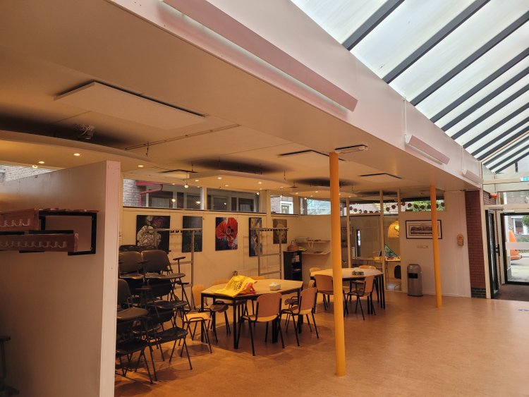 Kerkzaal 15 stuks hoog temperatuur stralers. bevestigd aan de trekstangen. Kerkzaal lage ruimtes 27 stuks laag temperatuur panelen met diverse vermogens gemonteerd in en aan het plafond in tussen hal zijn er nog 4 stuks panelen gemonteer met een hogere temperatuur. de panelen worden geregeld via een smart besturingssysteem.